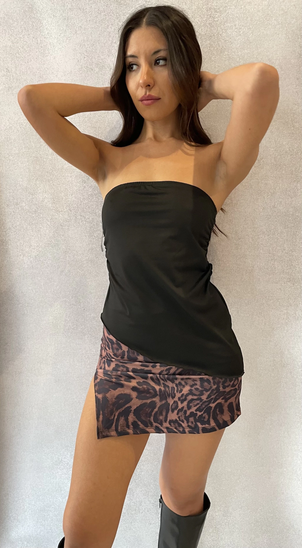 De Lycra, drapeado en un costado. 36 cm de ancho x 29 cm de largo en la parte más corta y 45 cm de largo en la parte más larga. Medidas tomadas en plano.